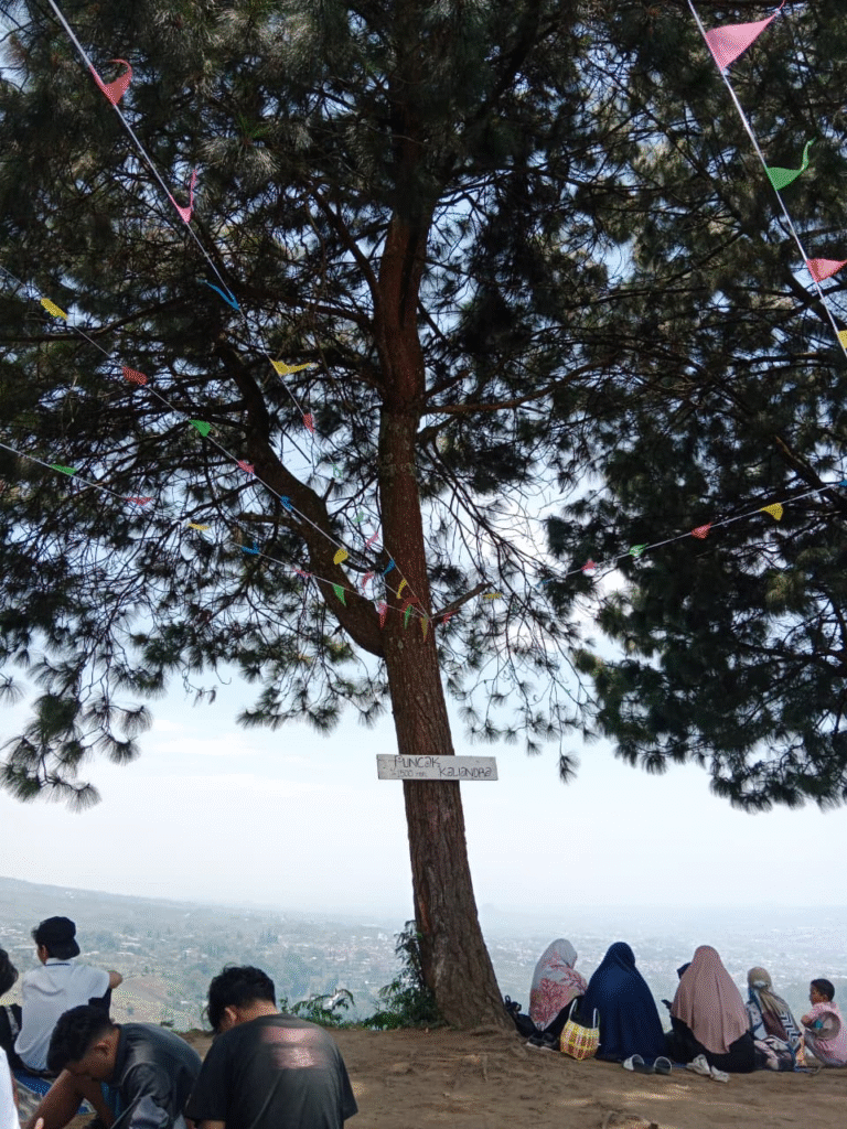 Momen santai di bawah rindangnya pohon pinus dengan latar pemandangan Kota Batu yang memukau, (Sahwahita)