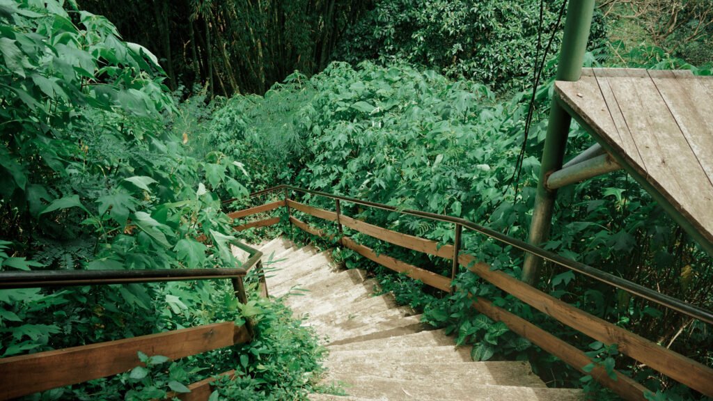 Penghubung bernuansa alami yang menuju keindahan air terjun.