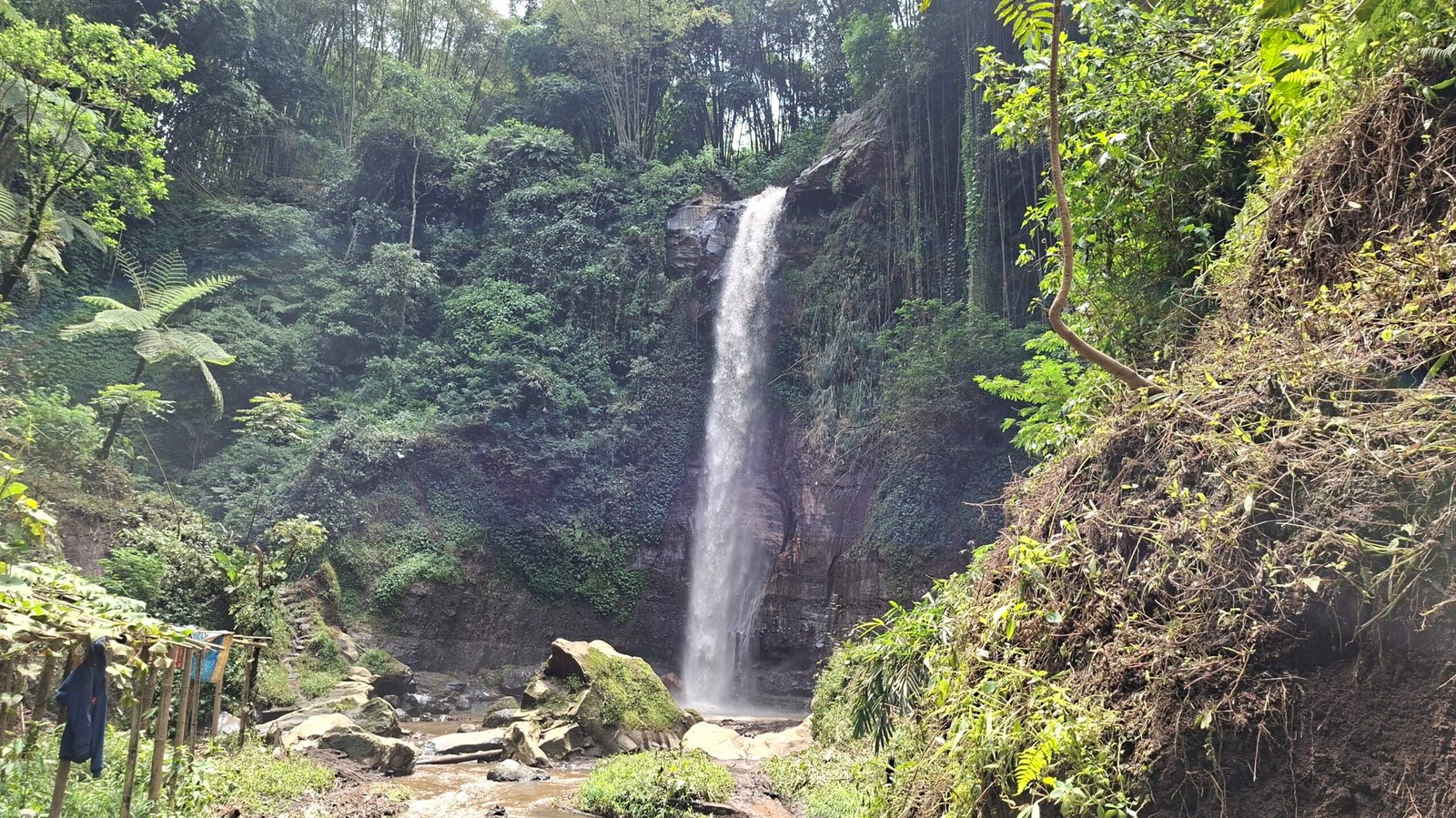 Setibanya di lokasi, pemandangan air terjun langsung menarik perhatian. Air mengalir dari ketinggian dan jatuh ke bebatuan di bawahnya, menciptakan percikan yang menyegarkan. Dinding tebing yang hijau dan lembap mengelilingi area air terjun, menambah kesan alami dan asri. Pengunjung biasanya berhenti sejenak untuk menikmati suasana atau mengabadikan momen.