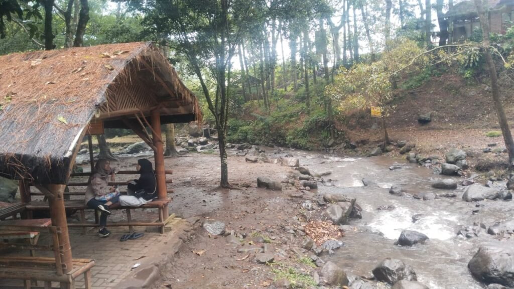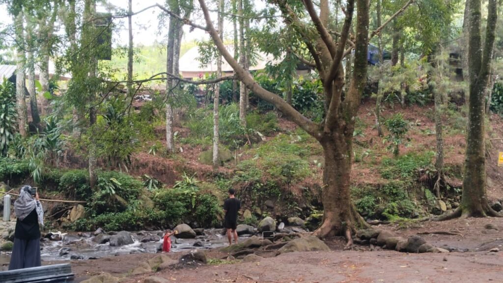Beberapa pengunjung memilih duduk di dekat aliran sungai untuk merasakan suasana yang lebih sejuk. Percikan air dan suara gemericik menjadi latar yang sempurna untuk bersantai.