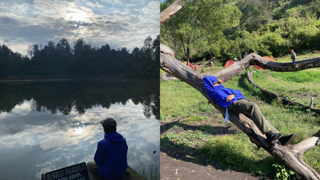 Foto kedua menangkap situasi yang kontras santai, hangat, dan apa adanya. Seorang pendaki rebahan di atas batang pohon besar di area camp, memanfaatkan apa yang ada sebagai kursi panjang alami. Tanpa ribet, tanpa peralatan tambahan.
